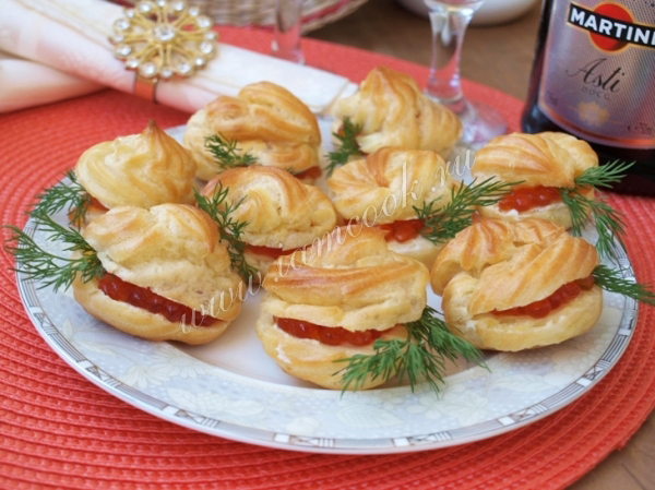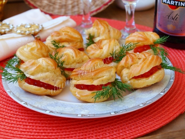 Профитроли - это небольшие кулинарные изделия, которые можно наполнять различными начинками. Если профитроли наполнить сладким кремом, муссом или джемом, то мы получим нежнейший десерт. Если профитроли приготовить с солёной начинкой, то у нас получится великолепная закуска, которая прекрасно подойдёт для праздничного стола. Сегодня мы готовим профитроли с красной икрой, которые прекрасно смотрятся на новогоднем праздничном столе.