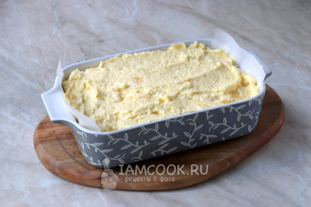 Тщательно перемешайте и выложите тесто в жаропрочную форму, застеленную пергаментом.