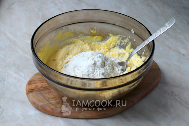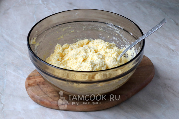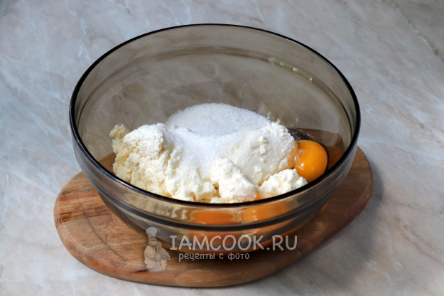 В глубокой миске соедините творог, сахарный песок и куриные яйца. Для аромата можете добавить одну чайную ложку ванильного сахара или ванилин на кончике ножа.