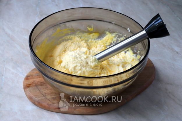 Перебейте массу погружным блендером до однородного состояния. Если у вас блендера нету, можно просто тщательно перемешать ложкой/вилкой или растолочь толкушкой для картофельного пюре.