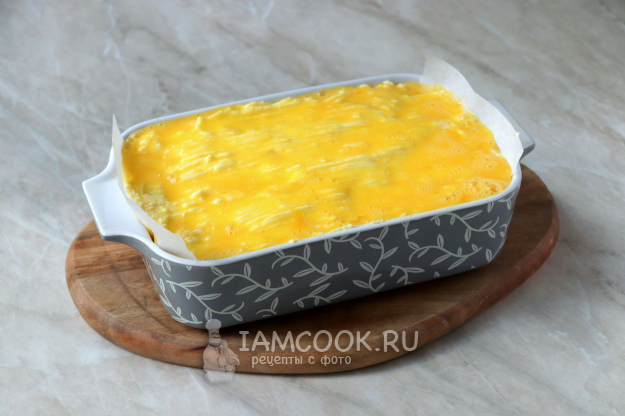 Куриное яйцо, которое мы оставляли для заливки, взбейте венчиком и вылейте поверх теста.