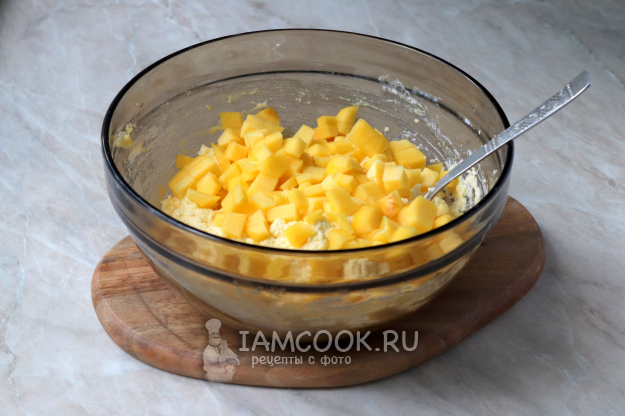 Персики очистите, удалите косточку, а мякоть нарежьте небольшими кубиками. Получившуюся нарезку отправьте в миску с тестом.