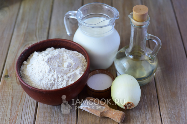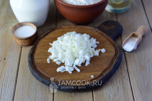 Подготовить продукты для баурсаков с луком на кефире. Почистить луковицу.