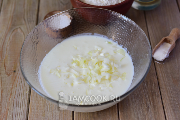 В просторную миску залить кефир, добавить измельченный лук и соль.