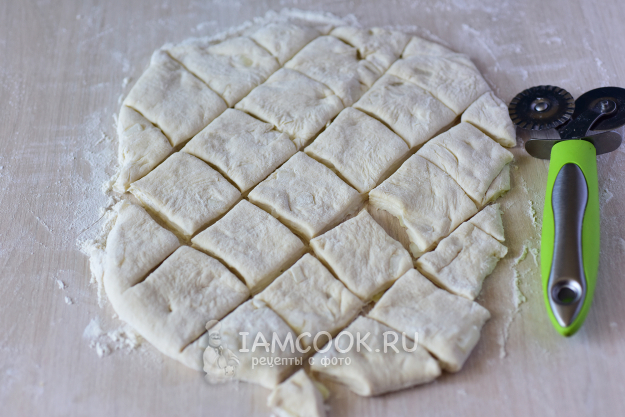 Припылить рабочую поверхность мукой. Раскатать из теста пласт толщиной в 0,7-1 см. Нарезать ножом пласт теста в виде ромбиков или квадратиков.
