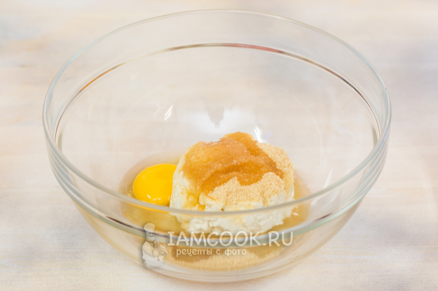 Смешайте яйцо, ванилин, сахар, масло, соль и творог.