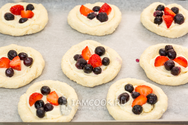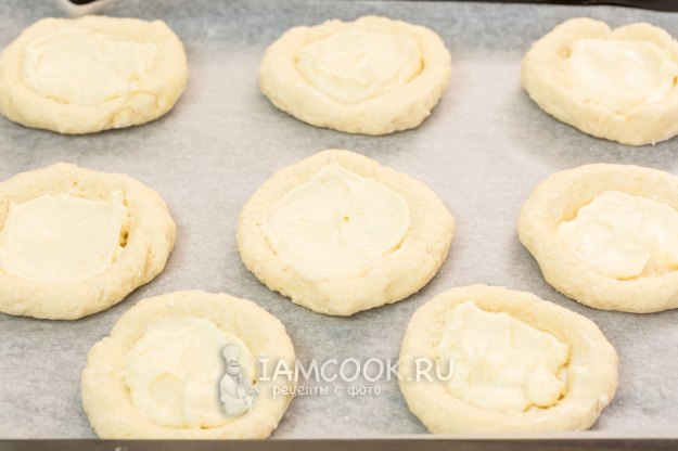 Смешайте составляющие для начинки (кроме ягод). Выложите начинку в заготовки ватрушек.