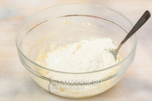 1. Ингредиенты на тесто, кроме муки и разрыхлителя, я перебила блендером до однородности, затем просеяла туда всю муку с разрыхлителем.