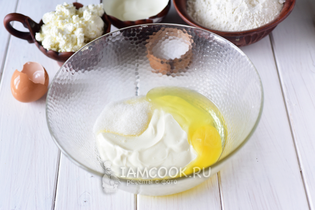 Приготовить тесто. В миску вбить яйцо, засыпать сахар, соль, выложить сметану.