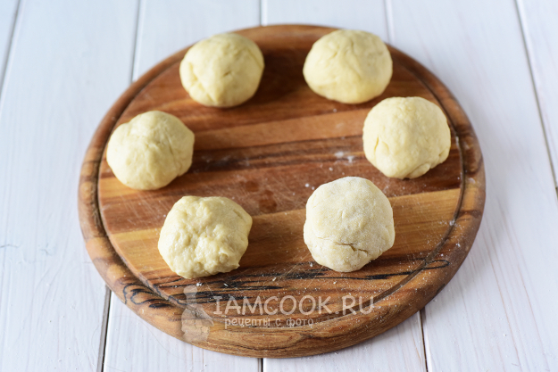 Я взвесила тесто и у меня получилось 400 г. Я разделила всё тесто на 6 кусочков - примерно по 65 граммов каждый. Включить духовку разогреваться до 180 градусов.