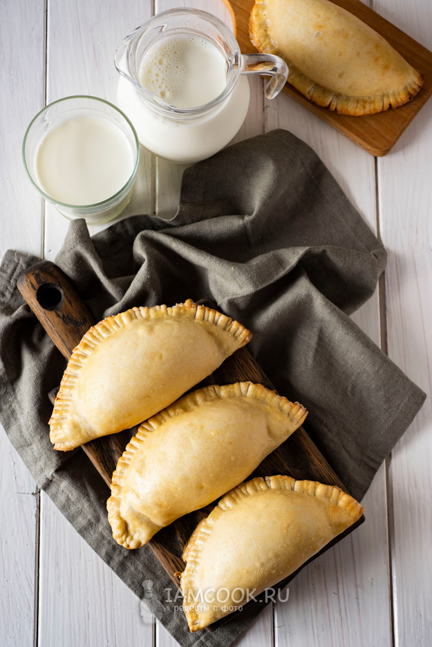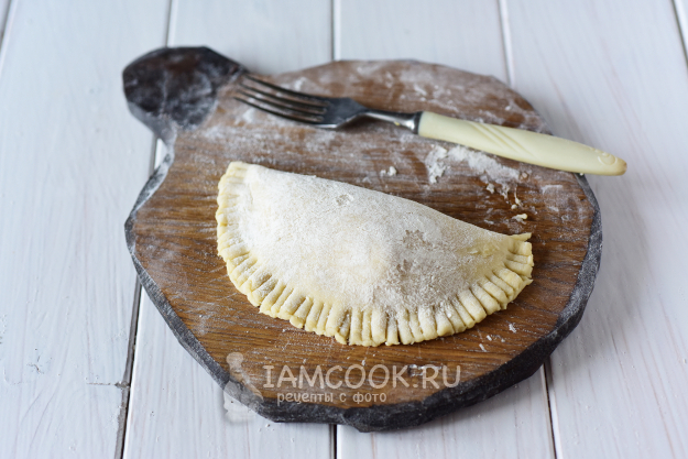 Второй половиной блинчика накрыть начинку и скрепить края будущего пирожка удобным для вас способом. Мне удобнее всего скреплять края заготовки вилкой. Противень застелить пергаментом для выпечки. Выложить на него все заготовки кокроков и смазать поверхность смесью яичного желтка и молока. Заполненный противень поставить в уже разогретую до 180 градусов духовку на 30-35 минут.