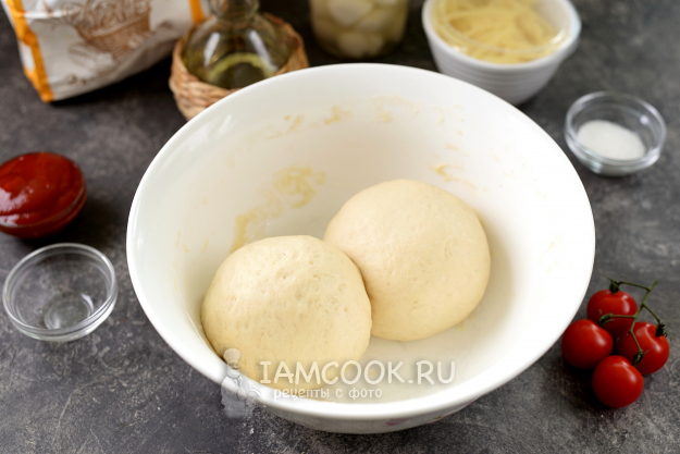 Вымесите тесто руками, разделите на две одинаковые порции.