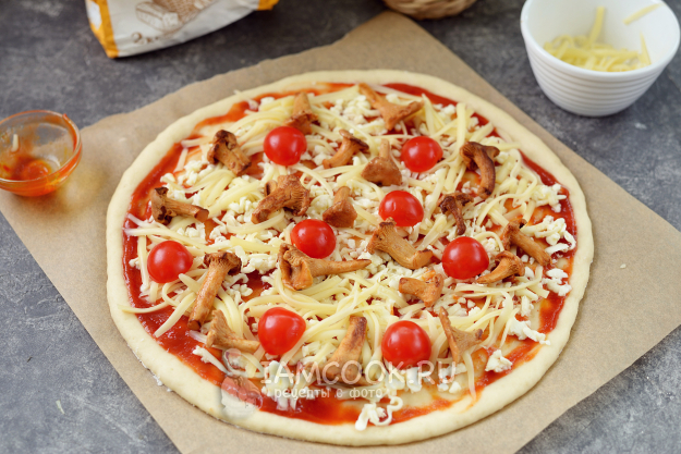 Слой моцареллы посыпьте натертым твердым сыром, который хорошо плавится при высокой температуре, сверху положите обжаренные лисички. Помидоры нужны для кислоты, поскольку лисички и сыры сладковатые. Отправьте заготовку в предварительно разогретую до 230 градусов духовку на 7-10 минут под верхний гриль.