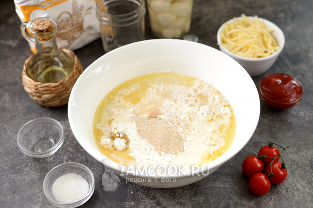 Влейте теплую воду, масло, всыпьте соль, сахар и дрожжи.