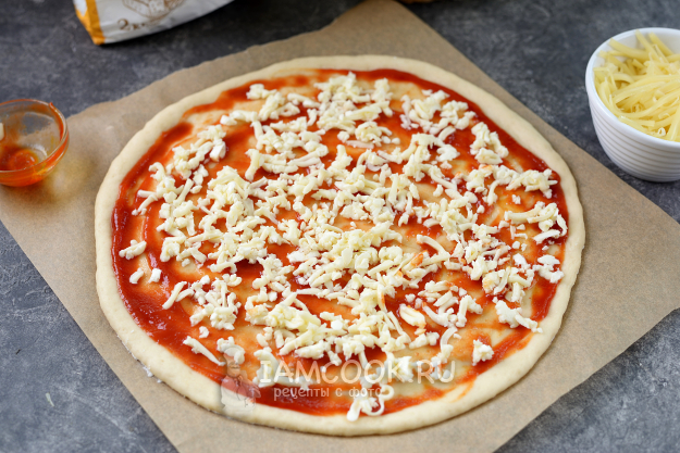Бумагу для выпечки чуть присыпьте мукой, раскатайте тесто тонким кругом, толщиной до 0,5 миллиметров. Смажьте тесто любимым томатным соусом, щедро посыпьте натертой моцареллой.