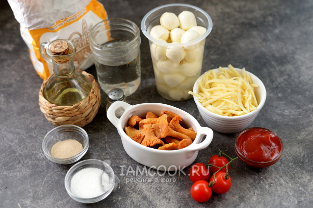 Подготовьте необходимые продукты для грибной пиццы с лисичками. Лисички положите в дуршлаг, помойте под слабой струей холодной воды, смойте весь песок или остатки земли.