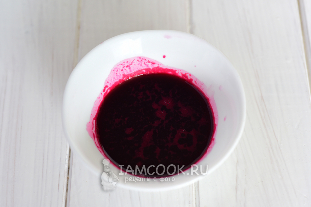 Почистить свеклу и натереть на мелкой терке. Полученную свекольную массу отжать через 2-3 слоя марли. Отделить 6 столовых ложек свекольного сока.