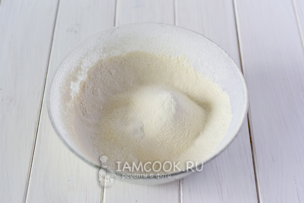 В миску просеять муку с разрыхлителем. Добавить соль.