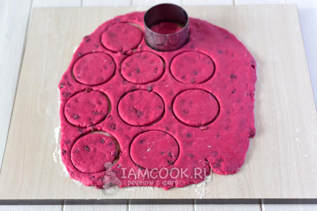 Раскатать свекольное тесто в пласт толщиной 0,7 мм. Кондитерским кольцом или любой другой формочкой сформировать заготовки будущего печенья. Противень застелить пищевым пергаментом для выпекания, на который выложить все свекольные заготовки.