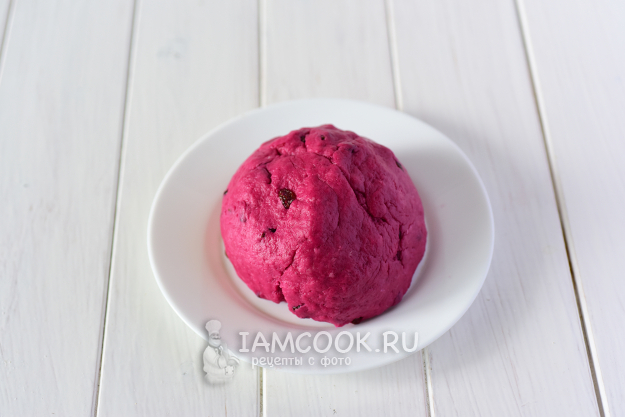 Замесить мягкое, не прилипающее к рукам тесто. Оно получается яркого свекольного оттенка.