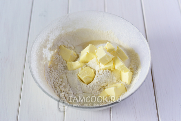 К мучной смеси добавить мягкое масло, порезав кусочками, влить молоко.