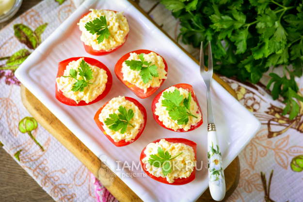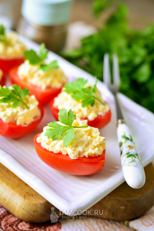Наполните половинки помидоров сырно-яичной начинкой с горкой.