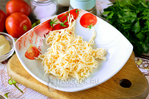 Охлажденный плавленый сырок натрите на мелкой терке. Используйте любой сорт сыра - "Дружба", "Сливочный", "Российский" или "Голландский".