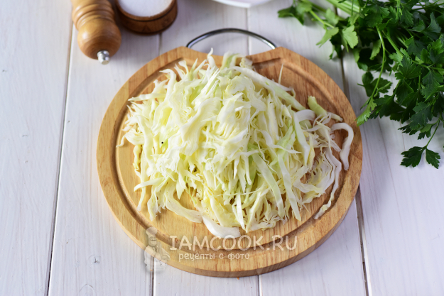 Капусту нашинковать тонкой соломкой.