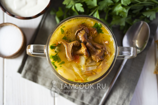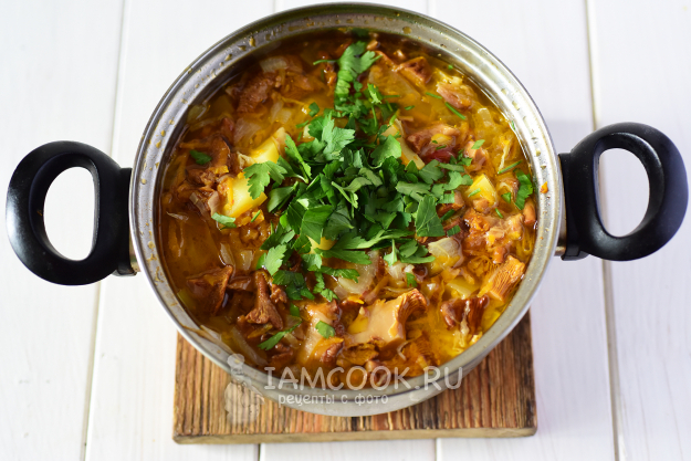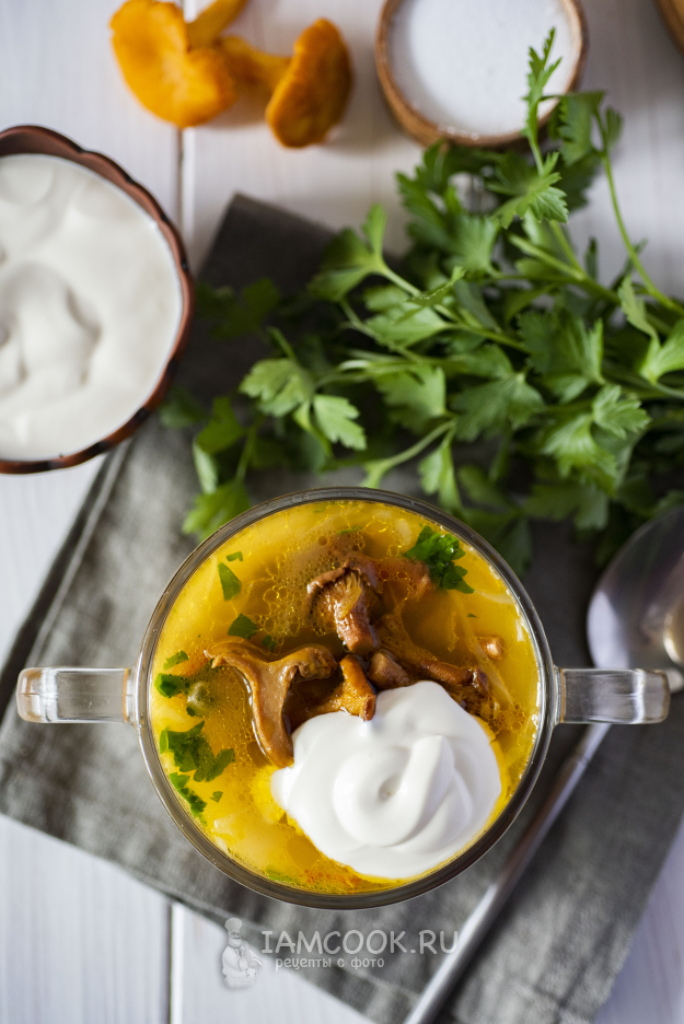 Через пять минут кастрюлю снять с плиты. Горячие щи с лисичками и свежей капустой разлить по порционным тарелкам и подать со сметаной на стол.