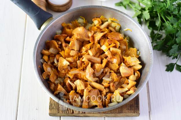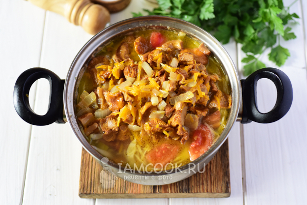 К овощам в сковороду добавить подготовленные лисички. Крупные грибы предварительно порезать на 2-3 части. Накрыть сковороду крышкой, убавить огонь до минимального и 10 минут томить все вместе.