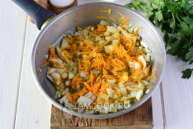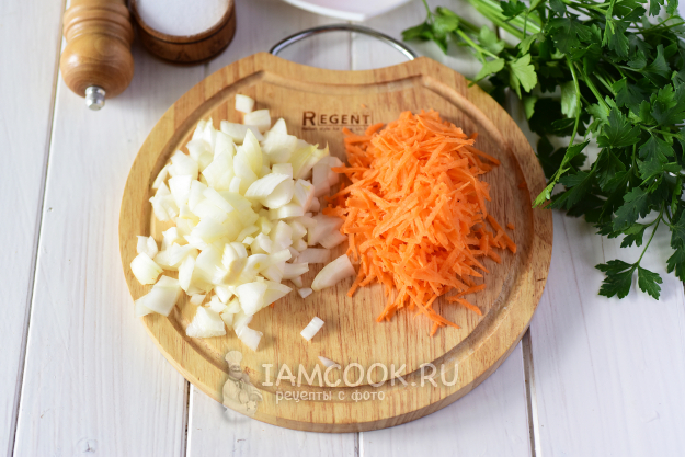 Мелко нашинковать лук, натереть на крупной терке морковь.