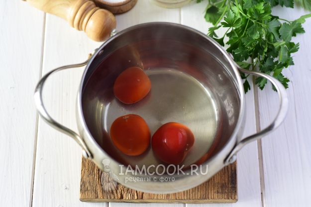 В отдельной кастрюле довести до кипения литр воды и аккуратно в кипяток выложить томаты.