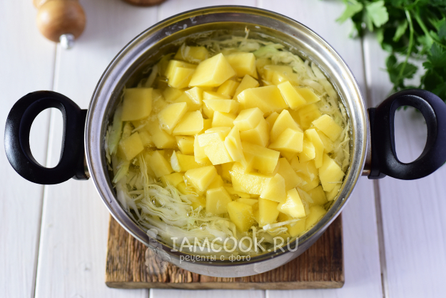Через 10 минут после капусты в кастрюлю выложить кубики картофеля. Добавить соль.