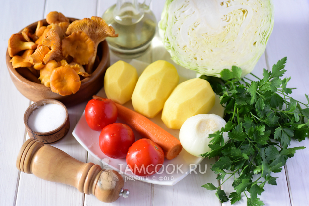 Подготовить ингредиенты для щей с лисичками и свежей капустой. Тщательно перебрать и помыть в теплой воде лисички. Очистить и помыть картофель и морковь. Очистить лук. Помыть петрушку, капусту и томаты.