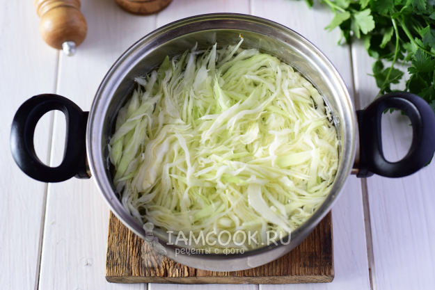 В кастрюле довести до кипения бульон или воду. Выложить в кипящую жидкость капусту.