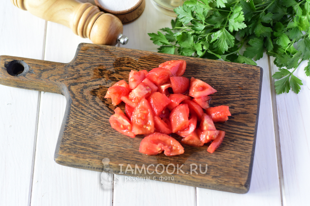 Через 3-4 минуты достать из горячей воды помидоры и с легкостью снять кожицу с каждого. Томатную мякоть порезать небольшими кусочками.