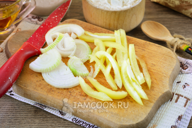 Нарежьте полукольцами репчатый лук и сладкий перец.
