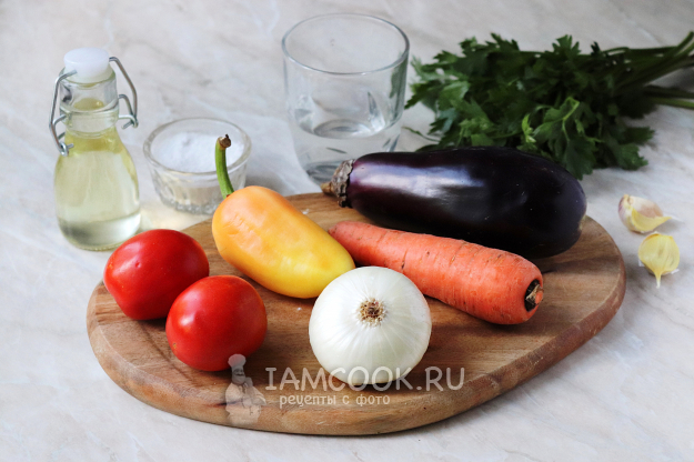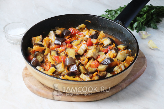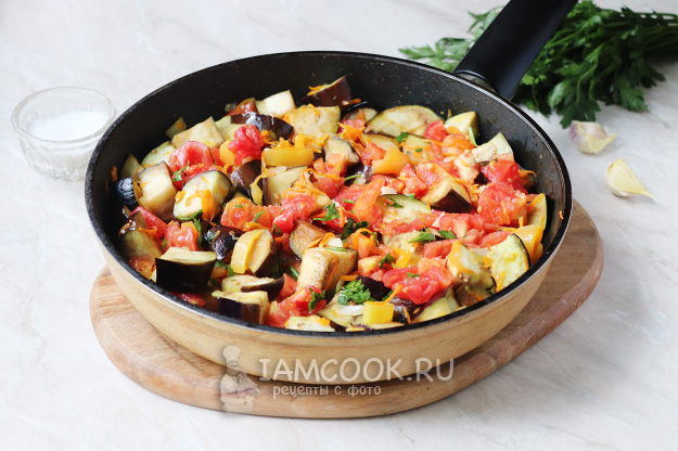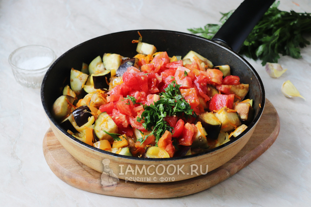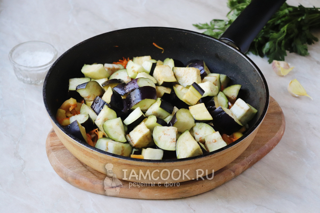 По истечению времени баклажаны ополосните холодной водой и выложите в сковороду с обжаренными овощами.