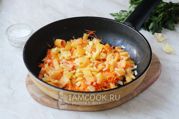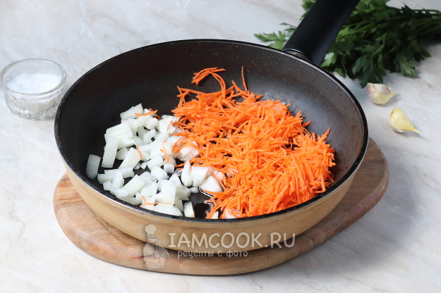 Репчатый лук нарежьте кубиками, морковь натрите на тёрке со средними ячейками. Отправьте овощи на сковороду с растительным маслом. Жарьте, периодически помешивая, 2-3 минуты.