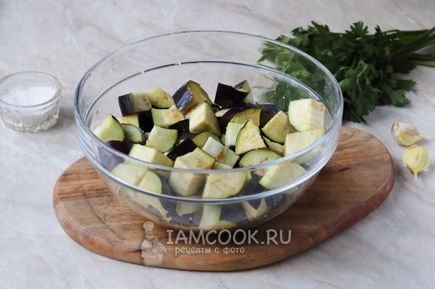 Баклажаны нарежьте крупными дольками или четвертинками, как вам больше нравится, главное, не слишком тонко. Выложите нарезку в миску и щедро посыпьте солью. Оставьте на 20-30 минут, чтобы ушла горечь.