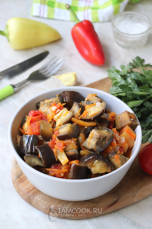 Готовые тушеные баклажаны с помидорами и перцем разложите по порционным тарелкам и подавайте в горячем виде на стол. В качестве дополнения отлично подойдёт картофельное пюре, отварной рис или макароны.