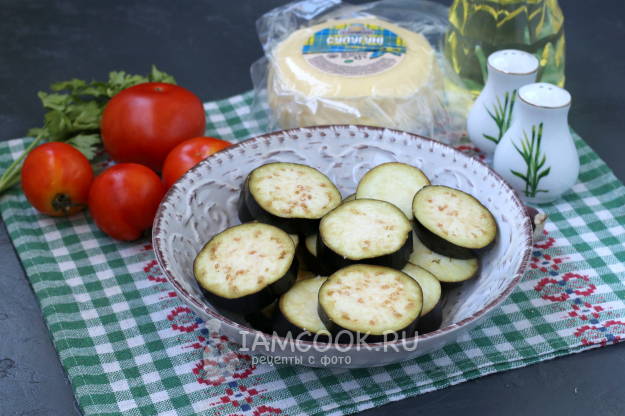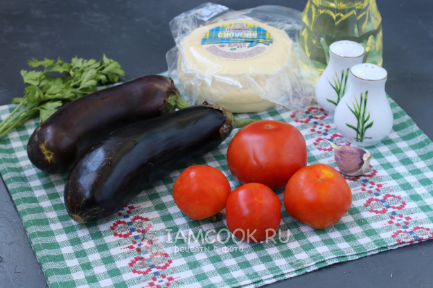 Для приготовления баклажанов с помидорами и сулугуни в духовке потребуются следующие ингредиенты.