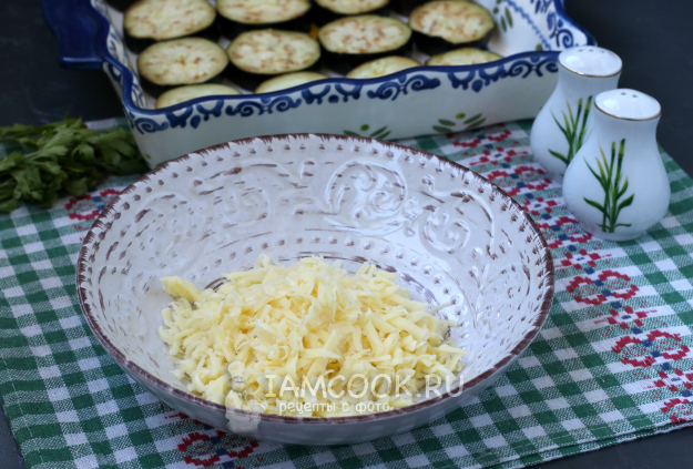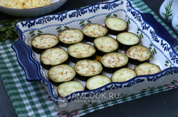 Подходящую форму для запекания смазать подсолнечным маслом. Протереть от соли кружочки баклажанов и выложить их в форму.