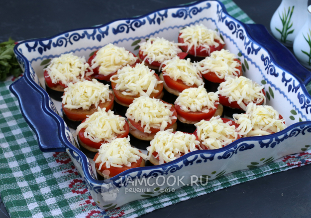 Посыпать баклажаны чесноком и сверху разложить кружочки помидоров. Помидоры посолить и поперчить, посыпать сверху сыром сулугуни.