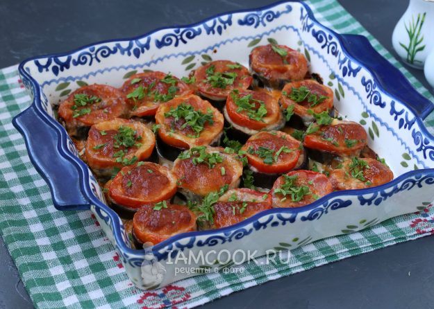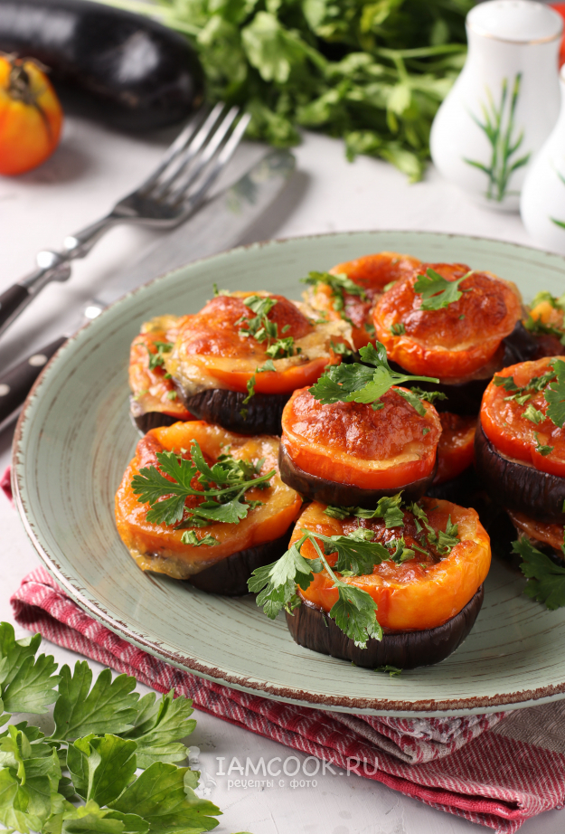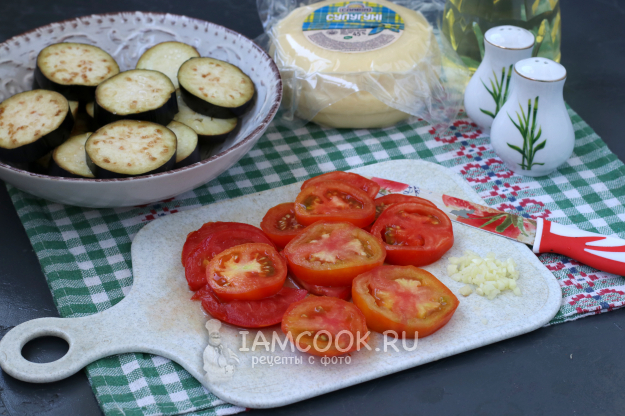 За это время нарезать кружочками помидоры и измельчить чеснок. Очень желательно, чтобы кружочки баклажанов и помидоров были одного размера. Если вам удастся так подобрать, то это идеально.
