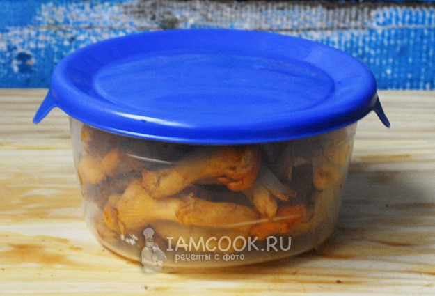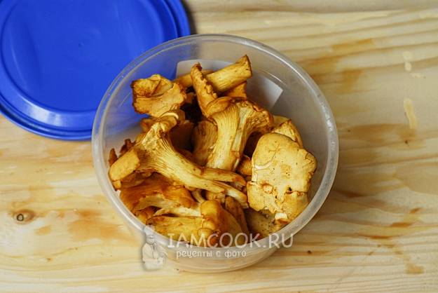 Очистим грибы от лесного мусора, промоем их и обсушим (лишний лед в морозилке нам ни к чему). Замораживать грибы можно в любой удобной таре — контейнерах, пакетах, лоточках и просто в целлофане. Сложим лисички в контейнер не плотно, чтобы не повредить грибочки.