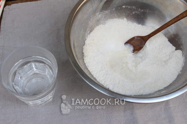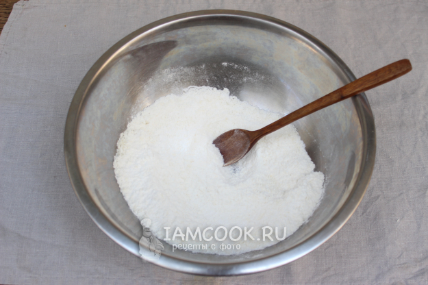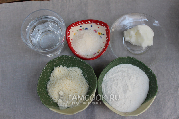 Берем чашку, которая будет удобной для замеса теста. Соединяем рисовую муку, кокосовую стружку, сахар (регулируем на свой вкус) и не забываем про щепотку соли.