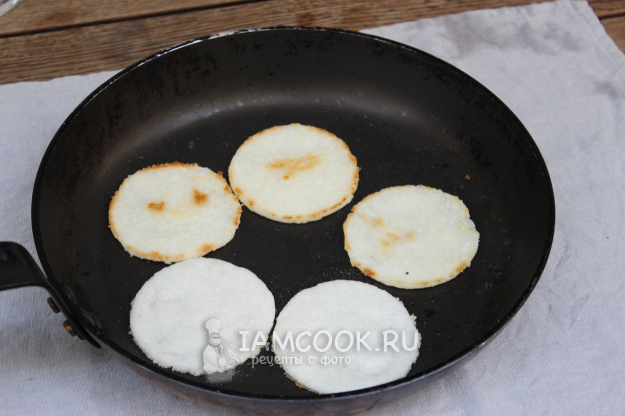 Обжариваем лепешки на кокосовом масле на среднем огне с двух сторон по 2-3 минуты. Должна получиться румяная золотистая корочка.