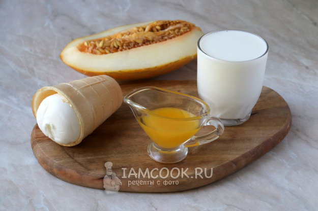 Подготовьте все ингредиенты для молочного коктейля с дыней. Благодаря блендеру его можно приготовить за считанные минуты. Сладость регулируйте мёдом, а если данный продукт противопоказан, замените его на сахарный песок (пудру). У меня была сочная сладкая дыня, ванильное мороженое и майский мёд.