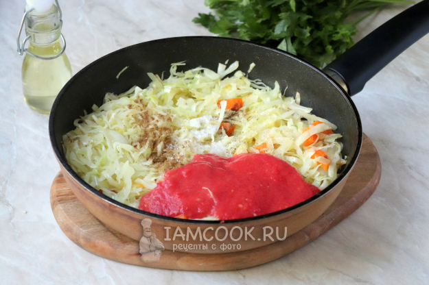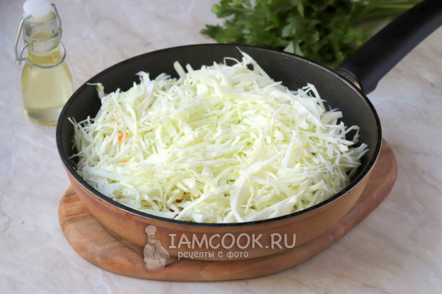 Тем временем нашинковать капусту тонкими длинными полосками и отправить к обжаренным овощам. Аккуратно перемешать и готовить 10 минут, пока капуста не уменьшится в объемах и не начнёт приобретать коричневый оттенок.